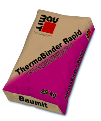 A Baumit ThermoBinder Rapid kötőanyaggal készített polisztirolbeton (a megadott keverési arány mellett) műszaki tulajdonságai kiemelkedőek: nyomószilárdsága 10%-os összenyomódásnál kb. 80 kPa, dinamikus merevsége pedig kb. 25 MN/m³. A kész polisztirolbeton száraz sűrűsége rendkívül alacsony, kb. 135 kg/m³, míg a friss habarcs sűrűsége kb. 180 kg/m³. A kész réteg kb. 2 nap múlva már óvatosan járható, és vastagságtól, valamint a keverék típusától függően 2-7 nap után már ráhordható a következő padlóréteg (pl. technológiai szigetelés és teherhordó esztrich). A kötőanyag 25 kg-os zsákos kiszerelésben kapható (56 zsák/raklap = 1400 kg). Száraz helyen, raklapon fóliázva 6 hónapig felhasználható. Ez a speciális kötőanyag ideális választás padlófűtés alatti hőszigetelő és kiegyenlítő réteg kialakítására, vagy régi fafödémek könnyűszerkezetes feltöltésére, ahol a kis súly és a jó hőszigetelés egyaránt elengedhetetlen.