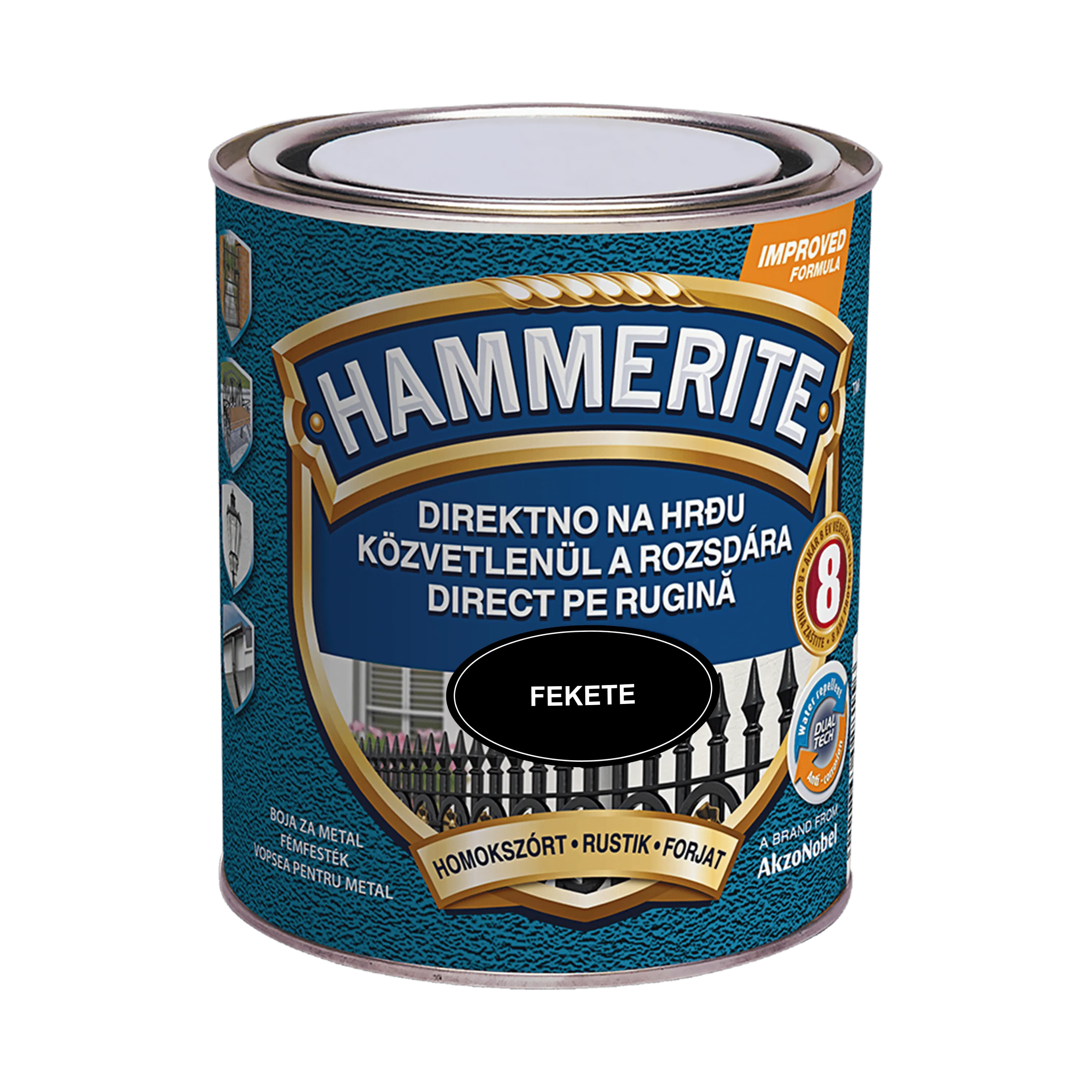 A Hammerite Közvetlenül a Rozsdára Homokszórt Felület egyedülálló fémfesték, amely alapozó és közbenső réteg nélkül, közvetlenül a rozsdára felhordható. A Dualtech technológia révén kiváló vízlepergető és korróziógátló védelmet nyújt, megóvva a fémfelületeket az időjárás káros hatásaitól akár 8 éven keresztül. A homokszórt megjelenés elegáns, különleges struktúrájú felületet képez, amelyet elsősorban kovácsoltvas felületek festéséhez ajánlunk a Hammerite Kalapácslakk felület mellett.