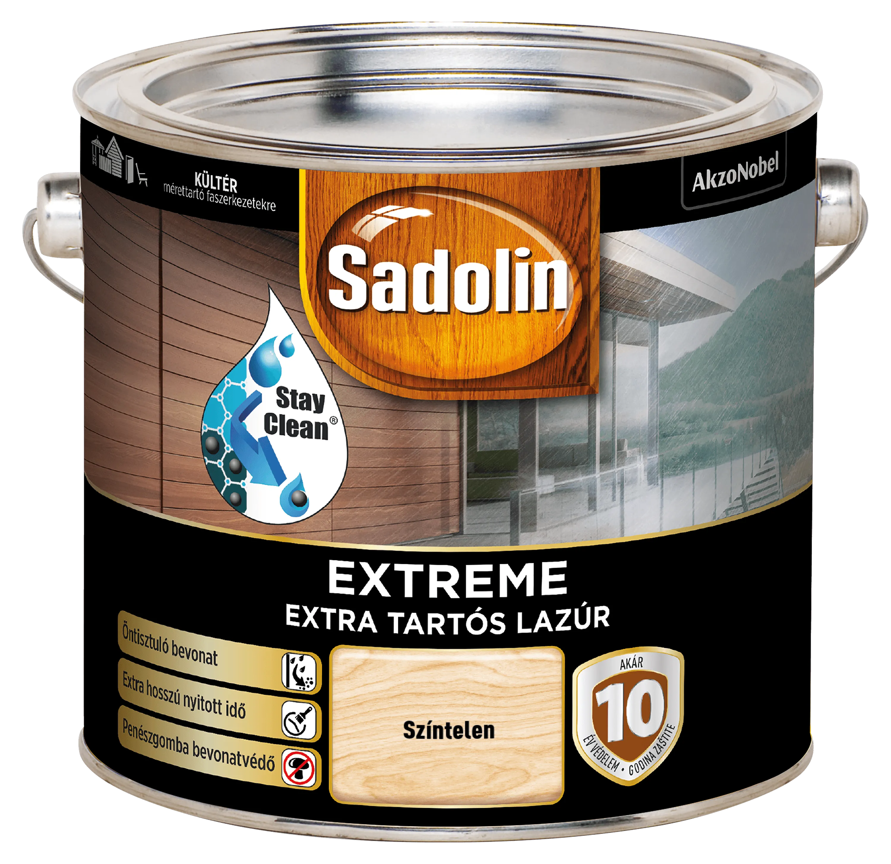 Kültéri fa felületeidet hosszú éveken át megóvhatod az időjárás hatásaitól, miközben megőrzik természetes szépségüket. A Sadolin Extreme Vizes bázisú vastaglazúr egy extra tartós, selyemfényű vastaglazúr, amely kimagasló védelmet nyújt a fának. Az innovatív StayClean® Technology öntisztuló bevonatot képez, így a felület tisztább, esztétikusabb és tartósabb marad. A Balance Technology pedig egyesíti a vizes és oldószeres lazúrok előnyeit: hosszú ideig eldolgozható, mégis gyorsan szárad és kiemelkedően tartós.